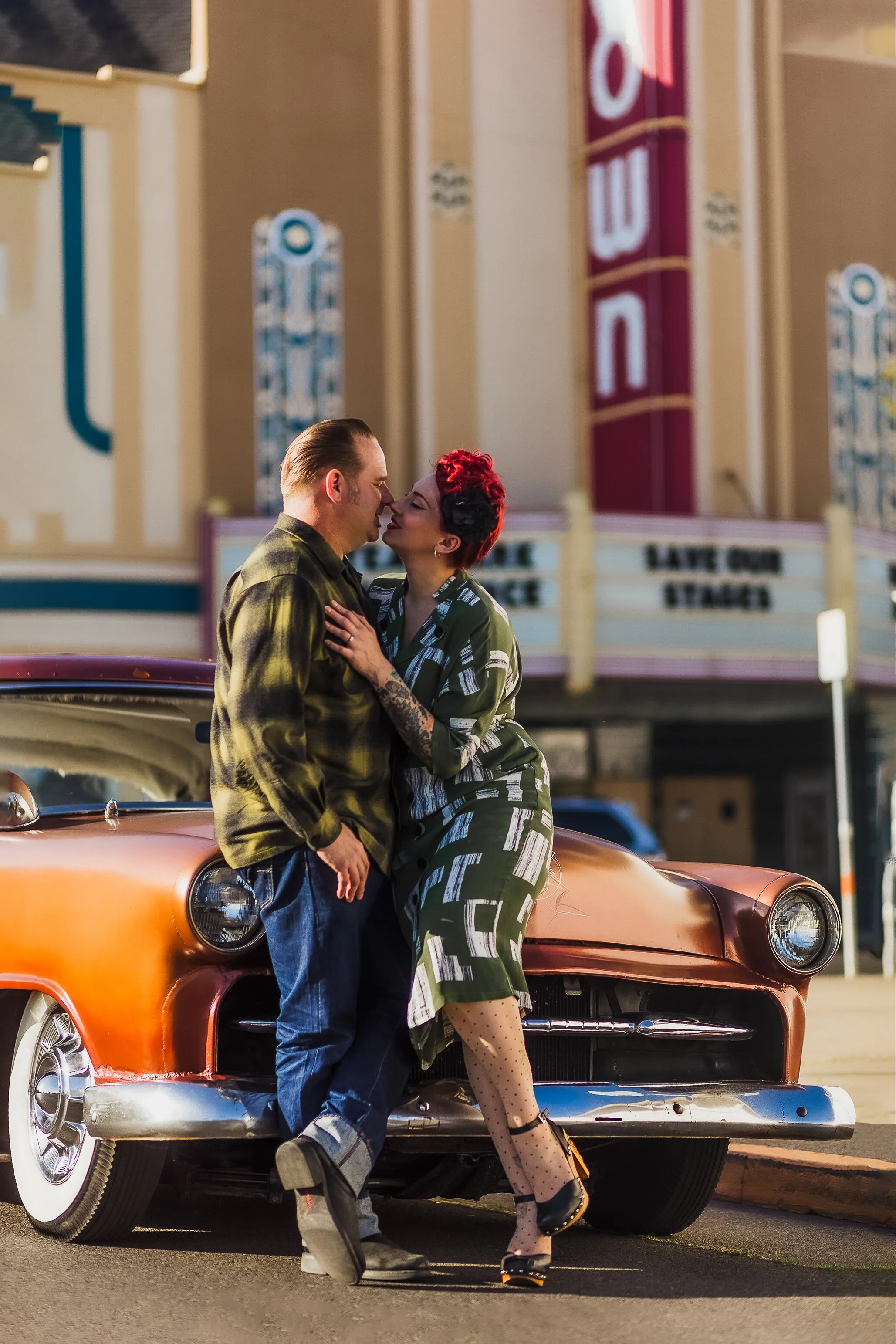 So really, what better way to celebrate their engagement than with a beautiful location and an equally beautiful car? Even though I live in Southern California, I love to travel and getting to be a Napa Valley wedding and engagement photographer for a day to get to photograph a couple in their hometown of Napa felt especially meaningful. We took their customized 1953 Ford out for a drive and parked it in front of the Uptown Theatre—perfectly matching the glitz, glam, and retro energy of this incredible couple.